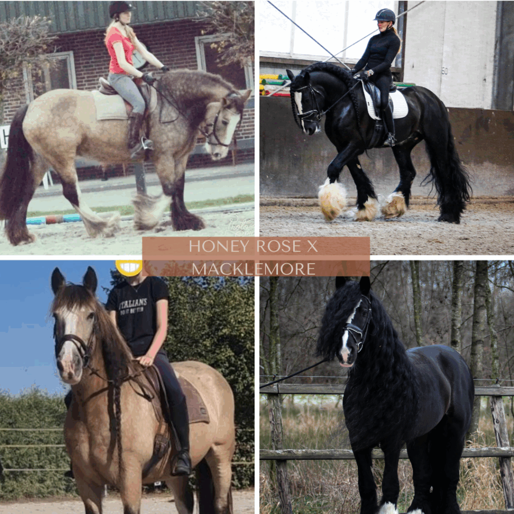 Honey Rose (1,60 m) en Macklemore (1,68 m) vormen samen een krachtige combinatie van formaat, beweging en karakter. Het toekomstige veulen zal waarschijnlijk hoogte, massa en elegantie combineren — met een sterk lichaam, expressieve bewegingen en een zacht, nieuwsgierig temperament. Verwacht elastische, ruime gangen, een rustig en mensgericht karakter, én kans op zeldzame kleuren zoals diepzwart, donkerbruin of zelfs valk met cream. Een opvallende partner voor sport, luxe of shows.
